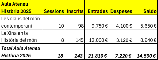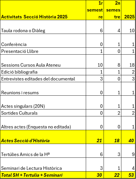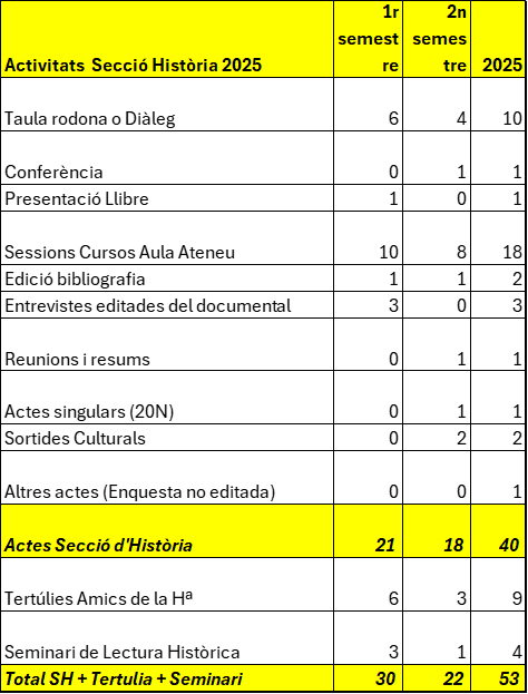 Destaquem només alguns indicadors i moments especials d’aquest 2025 que hem compartit amb totes les persones sòcies i amigues no sòcies de la Secció d’Història de l’Ateneu