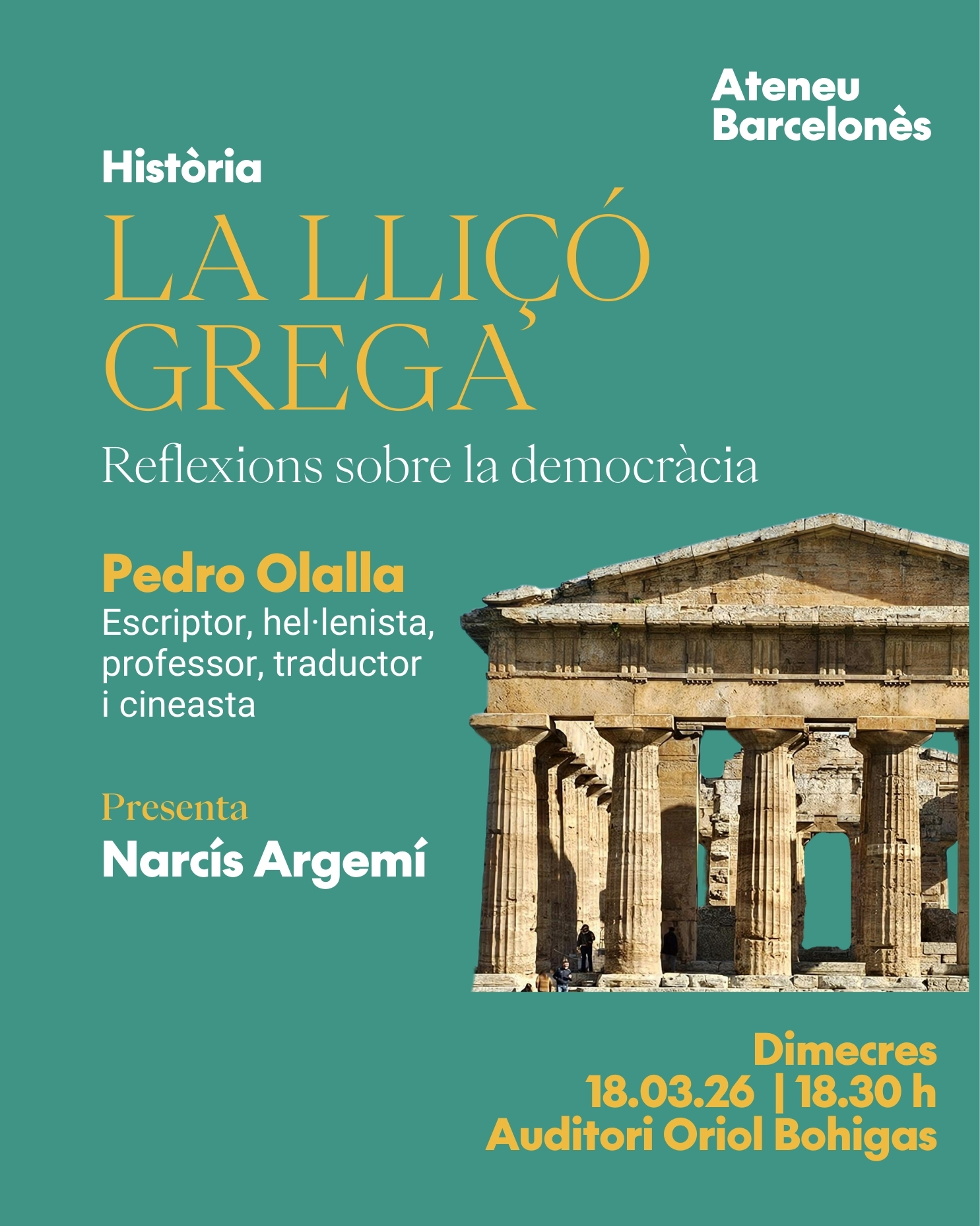 Dimecres 18 de març 18.30h Auditori Oriol Bohigas. Conferència de Pedro Olalla, escriptor, hel·lenista, professor i traductor. “La lliçó grega: Reflexions sobre la Democràcia.