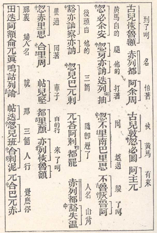 Maquetació d’una reedició xinesa de 1908 de la Història secreta dels mongols. Transcripció xinesa del text mongol. A la dreta, amb caràcters més petits, el glossari en llengua xinesa. 1240 (versió mongol)/probablement segles XIV-XV (versió xinesa). Font Erich Haenisch (trad.), Die Geheime Geschichte der Mongolen, Leipzig 1948