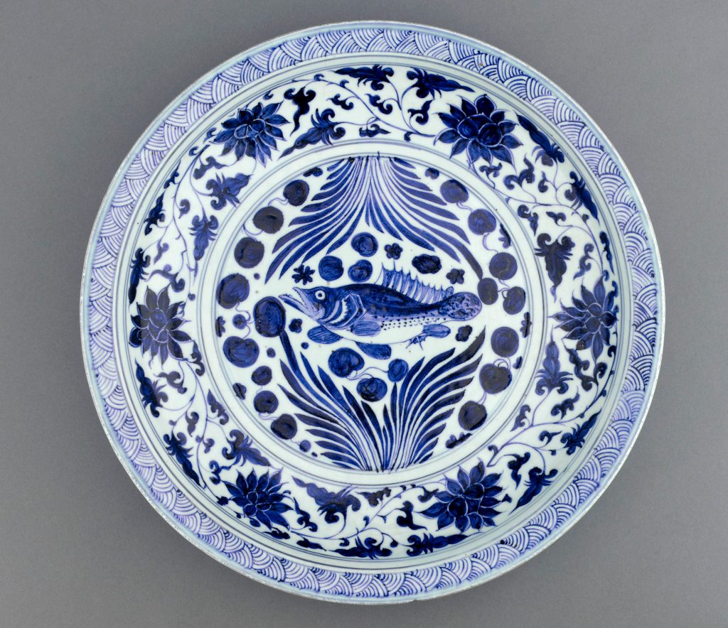 Plat amb disseny de peix mandarí, dinastia Yuan, mitjans del segle XIV, ceràmica Jingdezhen, porcellana amb pigment de cobalt sota esmalt incolor, Xina, província de Jiangxi, Jingdezhen, 8 × 45,5 cm (Freer Gallery of Art, Smithsonian Institution, Washington, DC: Compra — Charles Lang Freer Endowment, F1971.3)