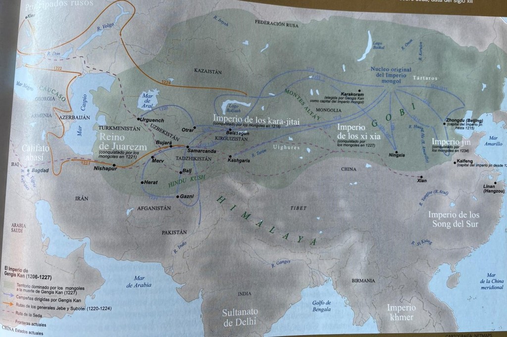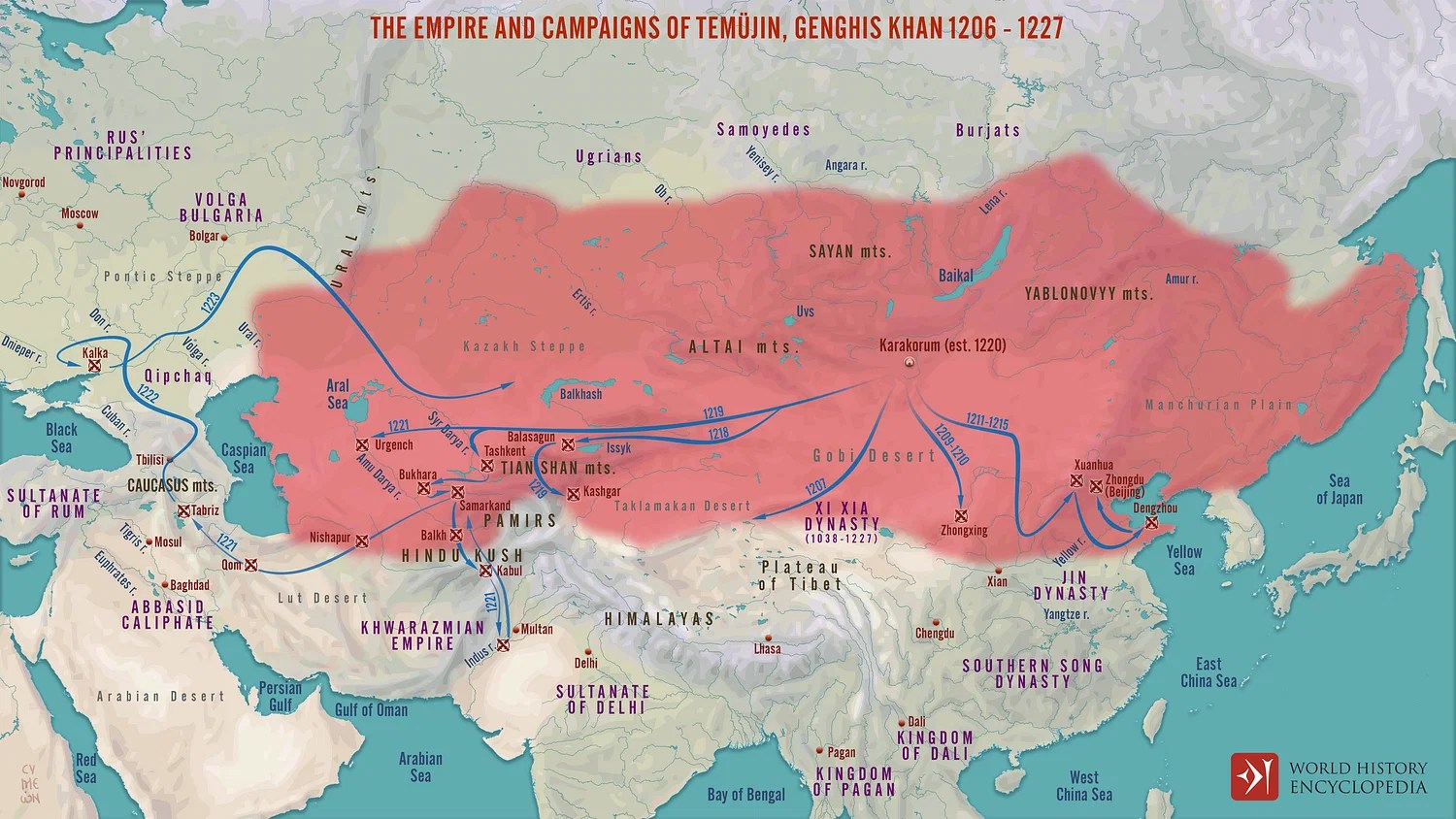 Un mapa que il·lustra les campanyes militars i l’expansió del territori mongol sota el lideratge de Gengis Khan després de la fundació de l’Imperi mongol el 1206 fins a la seva mort el 1227. Genghis Khan (1162-1227) va sorgir de la relativa foscor a l’altiplà mongol per establir-se. l’imperi terrestre més gran que ha existit mai, abastant tot el continent asiàtic des de la costa del Pacífic fins a Hongria al cor d’Europa. En el seu punt àlgid, l’imperi mongol cobria més prop de 30 milions de quilòmetres quadrats, una àrea tan gran com Àfrica. No obstant això, en aquesta Pax Mongolica, una carta de Tabriz es podria lliurar amb seguretat a Pequín (a una distància de 8.000 km) en aproximadament un mes. Aquest imperi enorme es va forjar a través de la visió, una administració capaç, múltiples estats asiàtics debilitats i, a l’esquena dels “cavallers del diable”, la cavalleria més gran, més ràpida i més versàtil que s’ha produït mai. Els descendents de Genghis van expandir el regne fins a Corea, Síria, Vietnam i Polònia, perdurant a través de la dinastia Yuan a la Xina, el khanat Chagatai a Àsia Central, l’Horda d’Or al sud de Rússia i la dinastia Ilkhanid al Gran Iran.