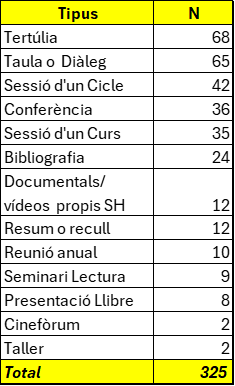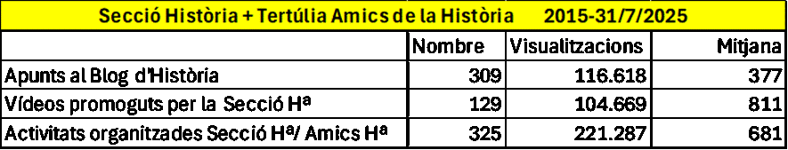 En el període analitzat d’1 de gener 2015 a 31 de juliol de 2025, s’han realitzat 325 activitats promogudes per la Secció d’Història i la Tertúlia Amics de la Història.
