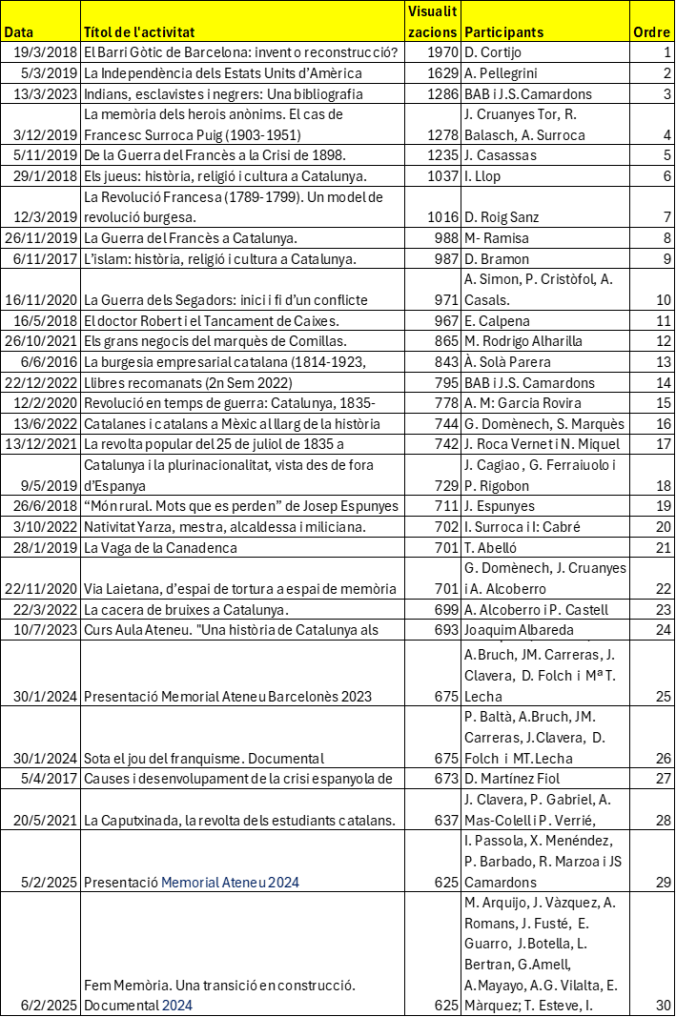 La majoria de les activitats s’han ressenyat en un apunt del Blog d’Història. El total de visualitzacions d’aquests 309 apunts és de 116.618. La mitjana és de 377 visualitzacions per apunt. Hi ha 105 apunts que superen aquesta mitjana. Podeu llegir una crònica o un resum d’aquests 309 apunts al Blog d’Història: https://historia.ateneubcn.cat/ . Hi ha un cercador de contingut (o lupa) a dalt a la dreta del Blog.