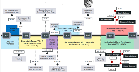 La Restauració borbònica (1874 – 1931) comença amb un cop d’estat del general Arsenio Martínez Campos (1831 – 1900) que fulmina l’autoritària i moribunda república del general Serrano. L’entronització del rei Alfons XII (1857 – 1885) donarà pas al sistema constitucional (1876) proposat per Antonio Cánovas del Castillo (1828 – 1897). El rei morirà aviat i la reina vídua, Maria Cristina d’Àustria (1858 – 1929) exercirà la Regència fins l’any 1902 quan el nen Alfons XIII (1886 -1941) arribi als setze anys, la majoria d’edat.